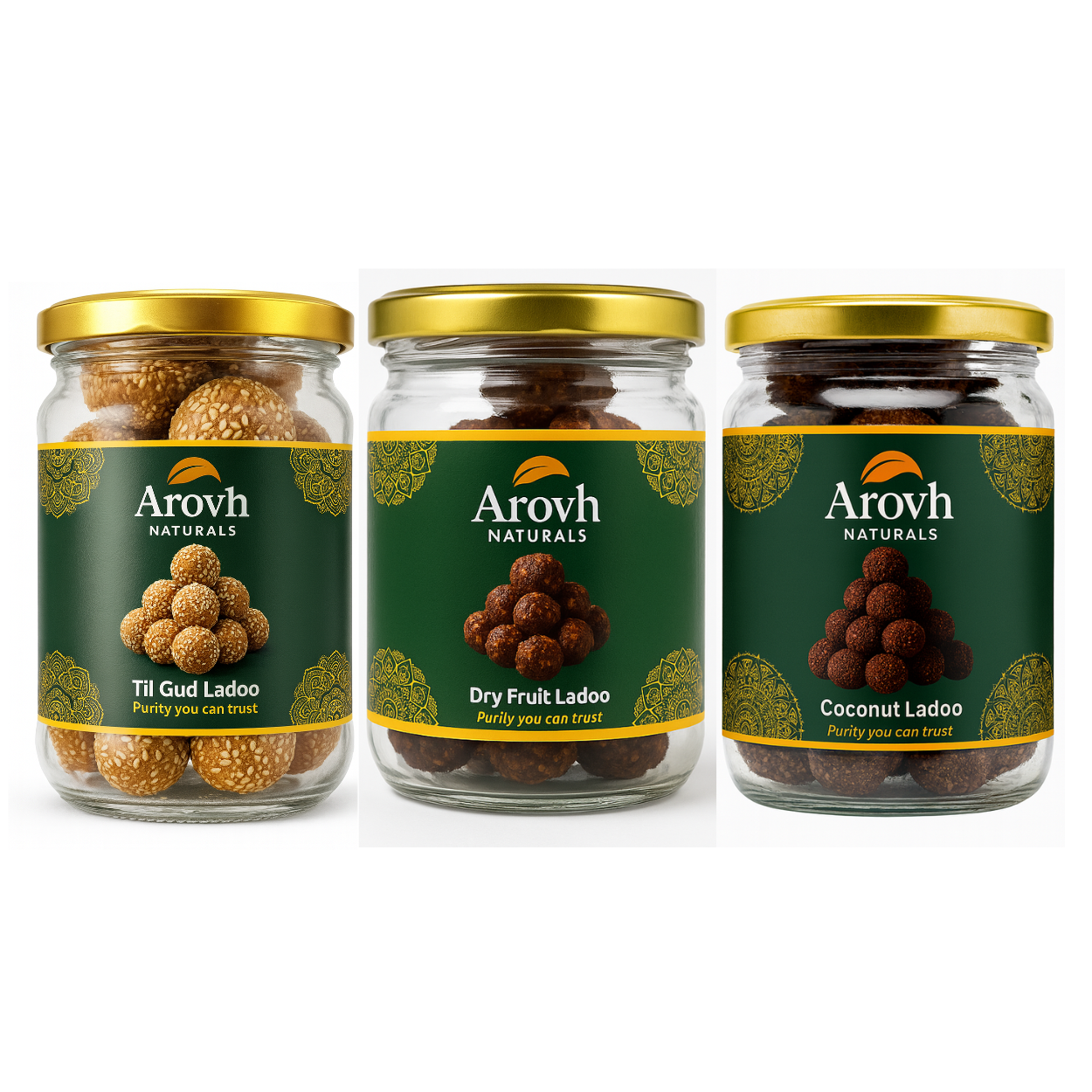 Arovh Naturals Trio Delight brings you the perfect blend of tradition and taste – Til Gud Ladoo, Dry Fruit Ladoo, and Coconut Ladoo. Made with pure ingredients, free from preservatives, and packed with wholesome goodness, this combo is ideal for gifting or indulging in healthy mithaas at home.